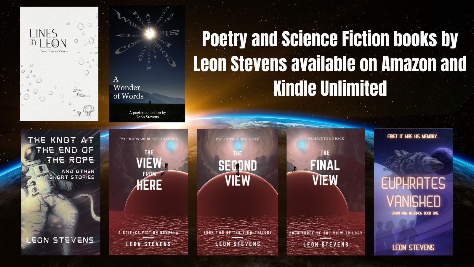 Leon Stevens is a multi-genre author, composer, guitarist, songwriter, and an artist, with a Bachelor of Music and Education. He published his first book of poetry, Lines by Leon: Poems, Prose, and Pictures in January 2020, followed by a book of original classical guitar compositions, Journeys, and a short story collection of science fiction/post-apocalyptic tales called The Knot at the End of the Rope and Other Short Stories. His newest publications are the novella trilogy, The View from Here, which is a continuation of one of his short stories, a new collection of poetry titled, A Wonder of Words, and his latest sci-fi mystery, Euphrates Vanished.